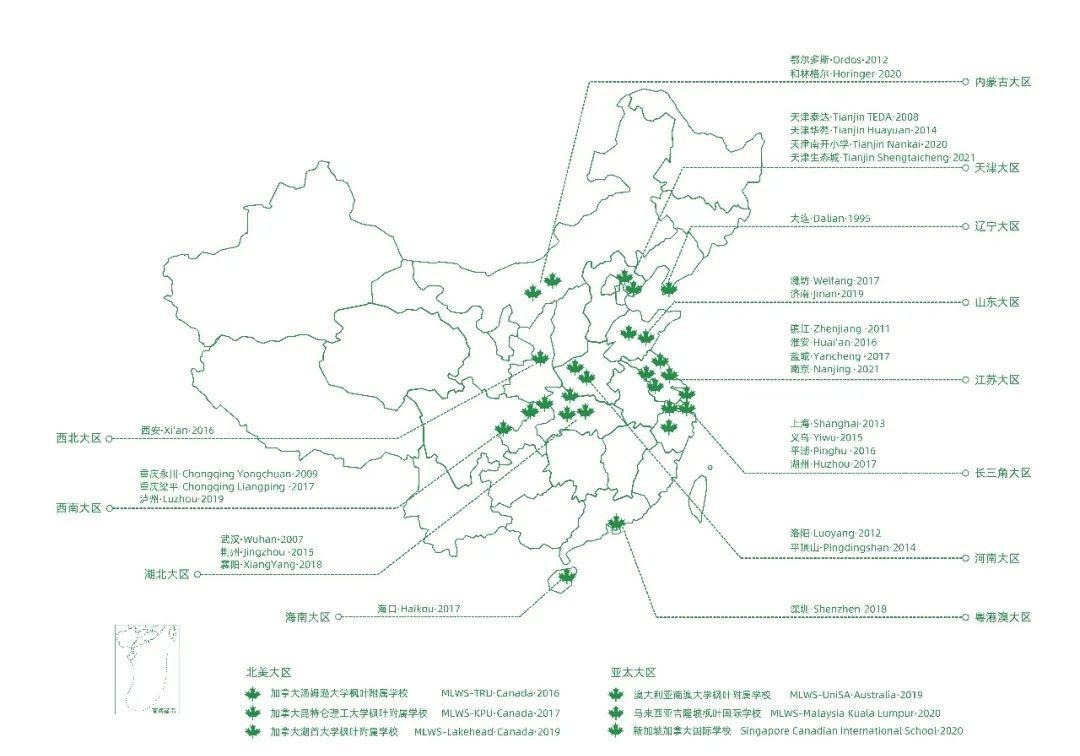 枫叶教育集团作为中国国际教育领军者之一,1995年创建以来,目前已在中国深圳、上海、天津、重庆、大连、武汉、镇江、洛阳、鄂尔多斯、平顶山、义乌、荆州、西安、淮安、平湖、湖州、潍坊、盐城、海口、襄阳、泸州、济南、呼和浩特以及加拿大温哥华、甘露市、布罗克维尔、马来西亚吉隆坡、新加坡等国内外30个城市开办学校120所,在校生规模达到46000多人,中外籍教职员工7000多名,形成集外籍人员子女学校、幼儿园、小学、初中、高中为一体的多层次高品质国际教育体系,获得社会广泛认可。
