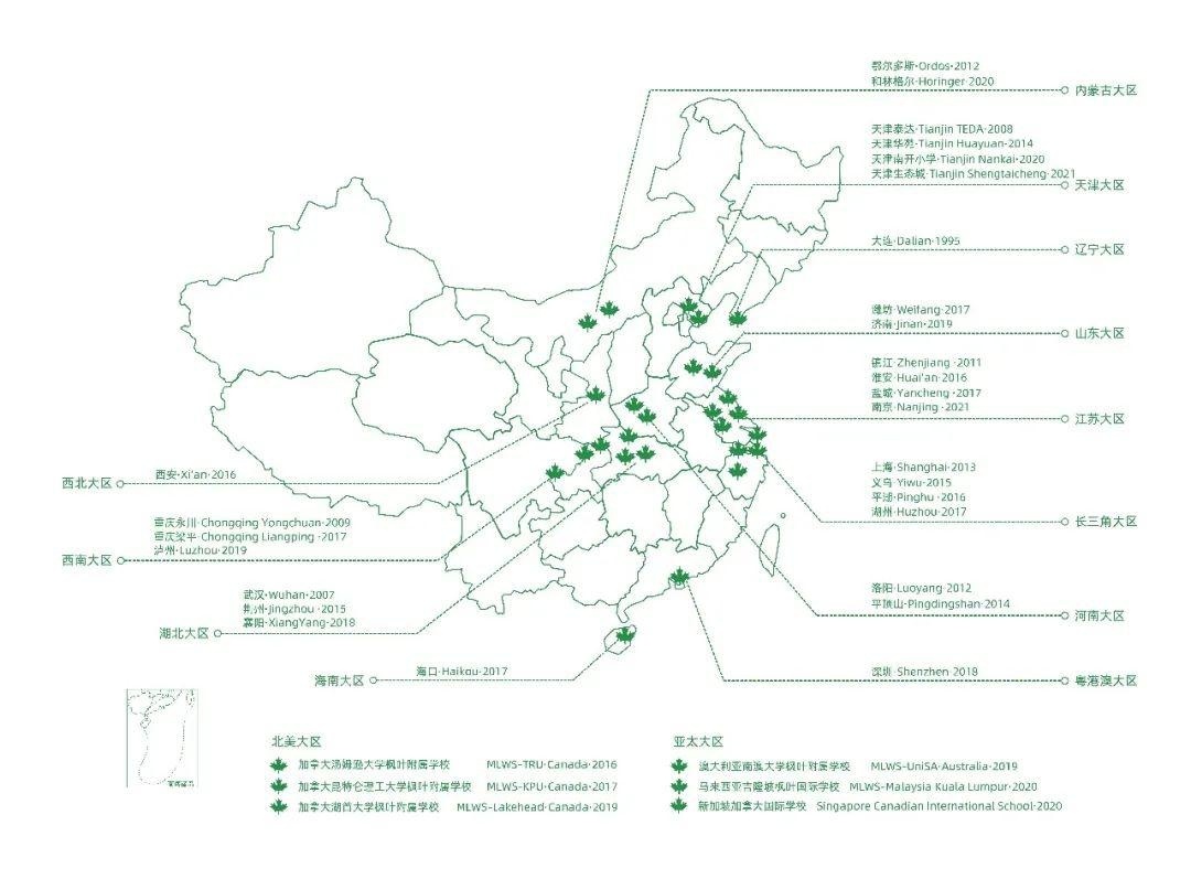 枫叶教育集团作为中国国际教育领军者之一,1995年创建以来,目前已在中国深圳、上海、天津、重庆、大连、武汉、镇江、洛阳、鄂尔多斯、平顶山、义乌、荆州、西安、淮安、平湖、湖州、潍坊、盐城、海口、襄阳、泸州、济南、呼和浩特以及加拿大温哥华、甘露市、布罗克维尔、马来西亚吉隆坡、新加坡等国内外30个城市开办学校120所,在校生规模达到46000多人,中外籍教职员工7000多名,形成集外籍人员子女学校、幼儿园、小学、初中、高中为一体的多层次高品质国际教育体系,获得社会广泛认可。