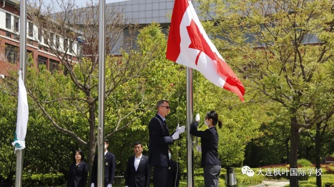 仪式项,由总领事处男校高一、高二年级主任,枫叶10年员工唐鹏先生、11-1班同学郭嘉怡升中华人民共和国国旗;男校加方高三年级行政专员,枫叶5年员工 Colin McFarland先生、11-1班包诗音同学升加拿大国旗;校办老师张晓莉女士、11-4班李洛宁同学。