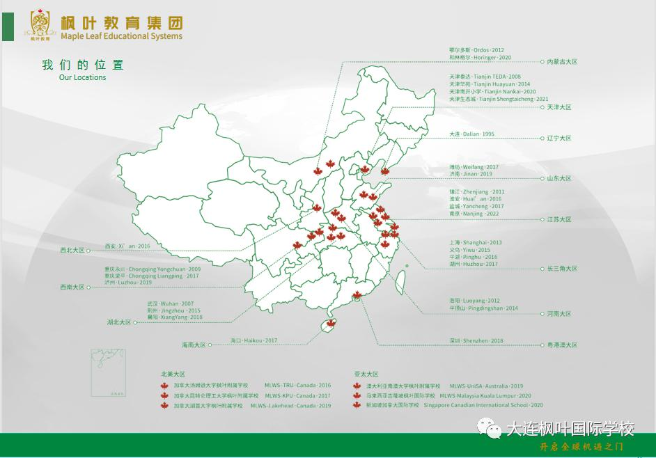 枫叶教育集团作为中国基础教育领域的国际教育领军者,1995年在大连首创枫叶国际学校,后于武汉、天津、重庆、镇江、洛阳、鄂尔多斯、上海、平顶山、义乌、荆州、西安、淮安、平湖、湖州、潍坊、盐城、海口、深圳、襄阳、泸州、济南、和林格尔、加拿大温哥华、甘露市、桑德贝、马来西亚吉隆坡、新加坡和澳大利亚阿德莱德等地创办枫叶国际学校,目前在校生45000余人。