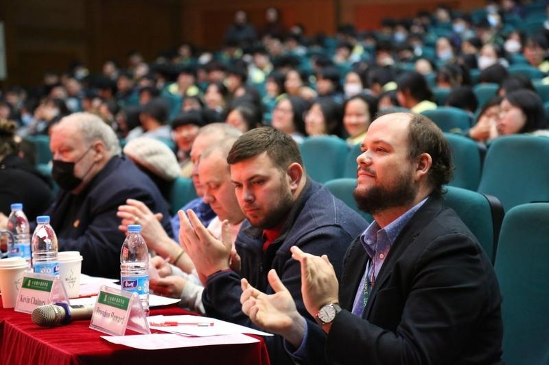 比赛当日,会场气氛热闹非凡。伴随着欢快的音乐和暖场视频,学生们在领事老师的带领下满怀期待地进入会场有序入座。一个个身着正装的志愿者,面带微笑地穿梭于会场各处,尽心竭力为比赛做志愿服务。随着中外方嘉宾领导和评委老师到场,主持人宣布比赛开始。原本激烈紧张的气氛,却因选手们时而搞笑,时而抒情,时而才情迸发的演讲前的短视频变得轻松欢快。选手们围绕着“Cherish life away from mobile phone.” (珍惜生命,远离手机); “When things are looking down, look up.” (当事情不如意时,想开点儿); “The rich cultural diversity of China in my eyes.”(我眼中的多元中国文化) 这三个话题进行了深入浅出的表达和阐述。